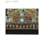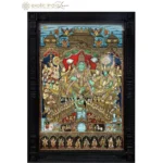 This museum-quality artwork portrays the complete Pattabhishekam scene with Lord Rama seated on the royal throne beside Sita, flanked by Lakshmana, Hanuman, Bharata, and other celestial beings. The intricate composition showcases elaborate architectural elements, detailed facial expressions, and ornate costumes that reflect the opulence of ancient Ayodhya’s royal court. Each element of the painting is rich with symbolic meaning, representing dharma, righteousness, and divine triumph, making it a deeply spiritual addition to prayer rooms, meditation spaces, or living areas.